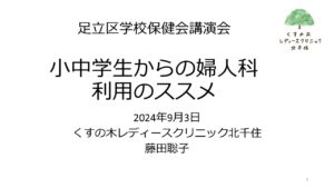 - 足立区学校保健会で足立区の養護教諭の方々を対象にお話ししました2024年9月3日に足立区学校保健会講演会で、足立区の養護教諭の方々を対象に「小中学生からの婦人科利用のススメ… 続きを読む: 足立区学校保健会で足立区の養護教諭の方々を対象にお話ししました