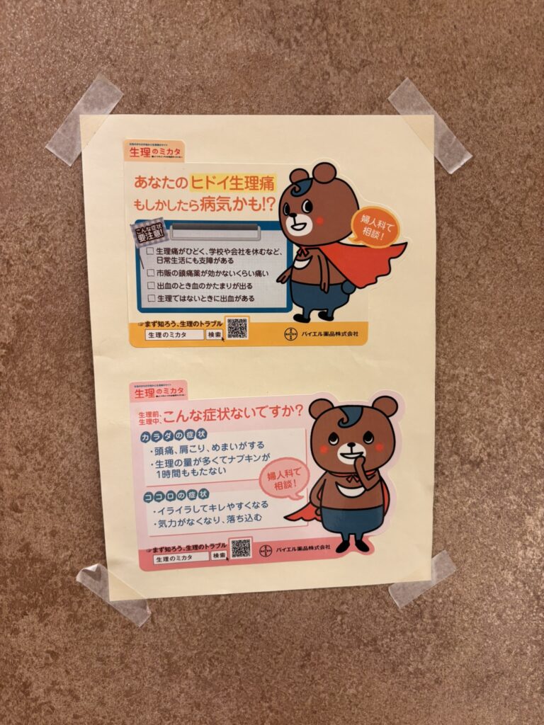 女子校のお手洗いには生理に困ったら受診を勧めるようなパンフレットが置かれていました。養護の先生の努力に頭が下がります。